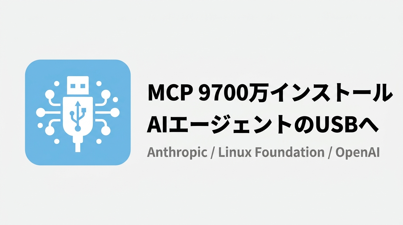 AnthropicのModel Context Protocol(MCP)が月間SDKダウンロード9700万を突破。OpenAI・Google・Microsoftが競ってサポートし、Linux Foundation傘下で中立標準化。「AIエージェントのUSB」が16ヶ月で業界共通規格に至った経緯を解説する。