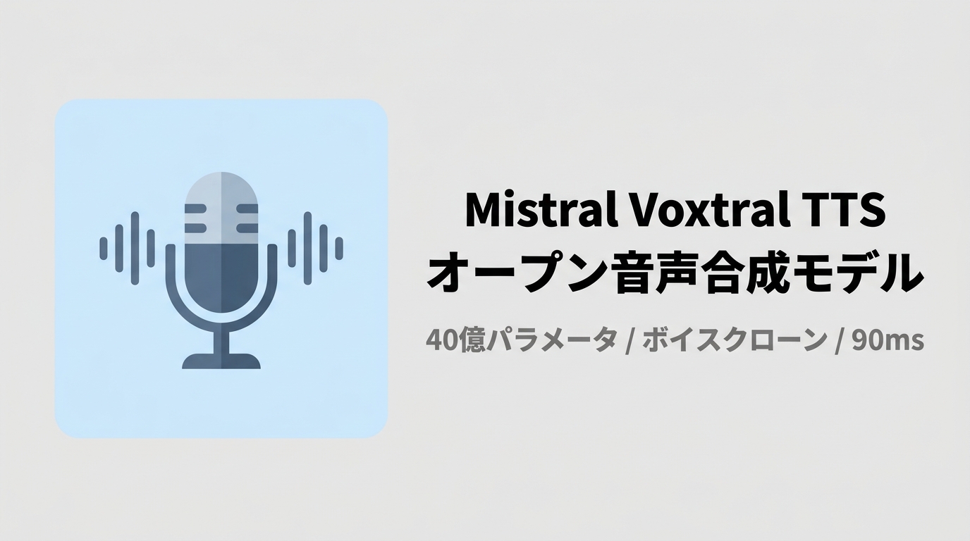 Mistral AIが40億パラメータの音声合成モデル「Voxtral TTS」をオープンウェイトで公開。2〜3秒の音声サンプルから話者をクローンし、ElevenLabsの最高品質モデルと同等の自然さを実現。音声合成市場をオープン化する衝撃のリリースを解説する。