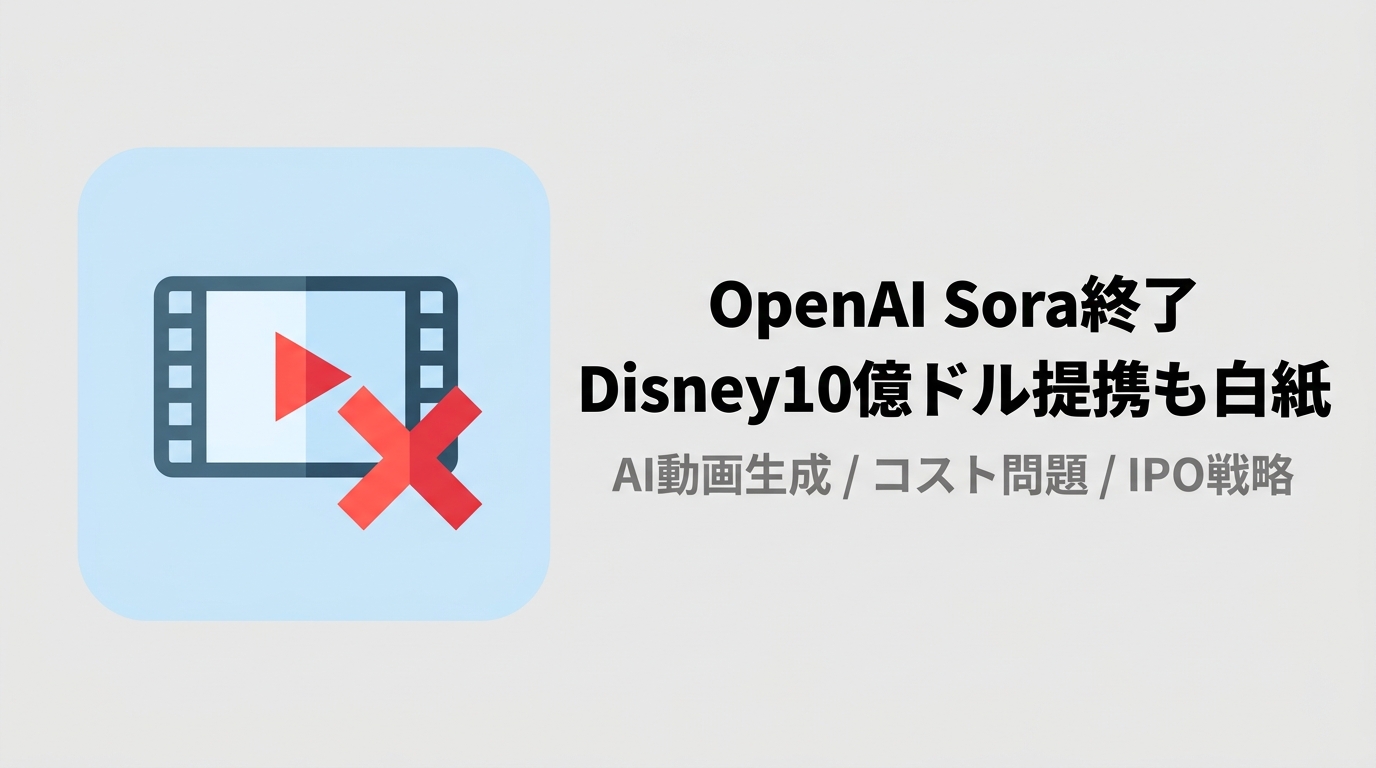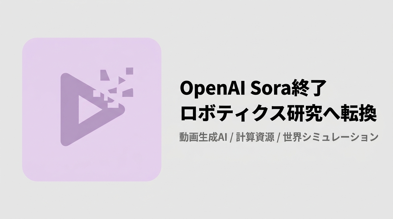 OpenAIが動画生成AI「Sora」の完全終了を発表。4月26日にアプリが閉鎖、9月24日にAPIも終了。Disney10億ドル提携も破棄へ。計算資源をロボティクス研究に集中する方針転換の背景と、動画生成AI市場の競争実態を解説する。