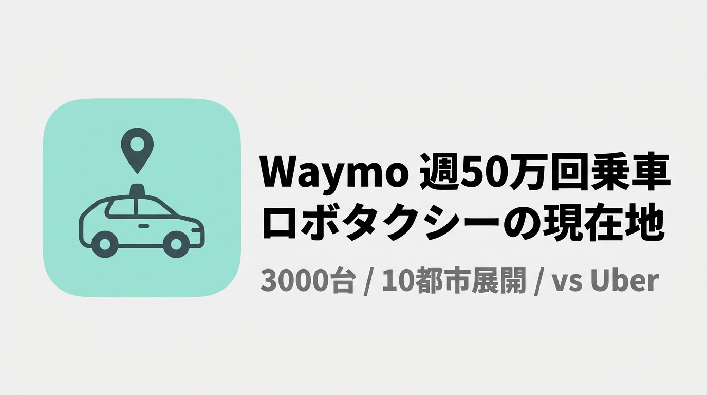 Waymoの週間乗車回数が50万回に到達。2024年5月の5万回から2年で10倍の急成長で、3000台のロボタクシーが10都市で稼働中。車両台数横ばいのまま稼働率が上昇する自動運転スケーリングの実態と、Uberとの差を冷静に読み解く。