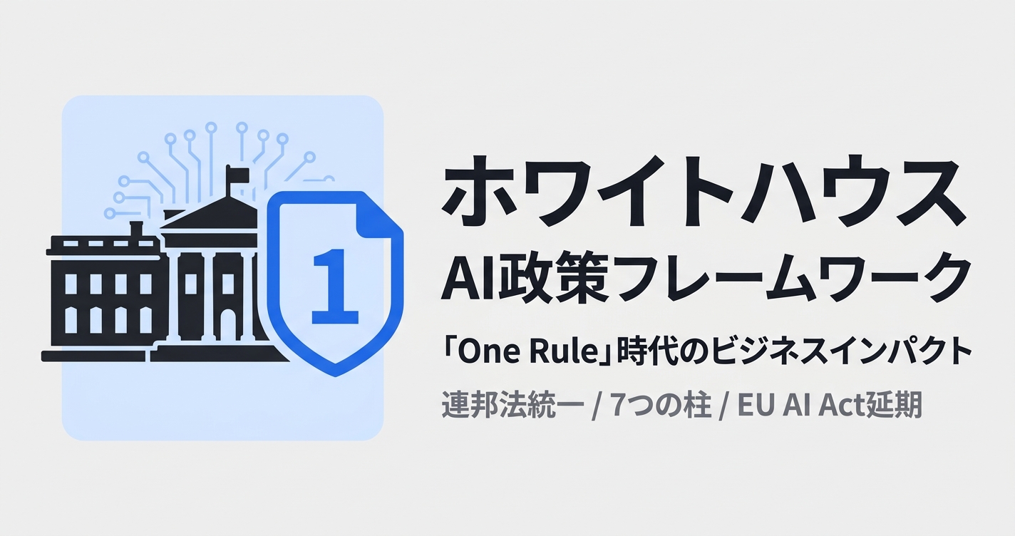 2026年3月20日、ホワイトハウスが「National Policy Framework for AI」を発表。50州バラバラの規制を連邦法で統一する「One Rule」構想は、企業のAI導入コストをどう変えるのか。EU AI Actの延期動向とあわせて解説する。
